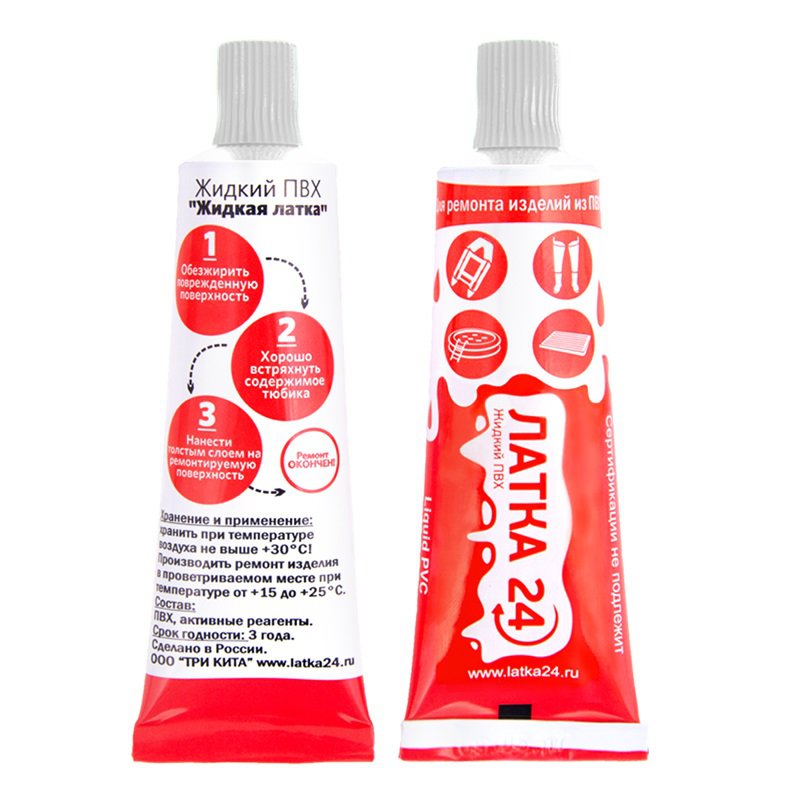 ЛАТКА24 для ремонта любых изделий из ПВХ. Теперь Вам не придется искать латку из похожего материала, чтобы заклеить поврежденные матрас или лодку. Достаточно нанести несколько капель на прокол или порез.
