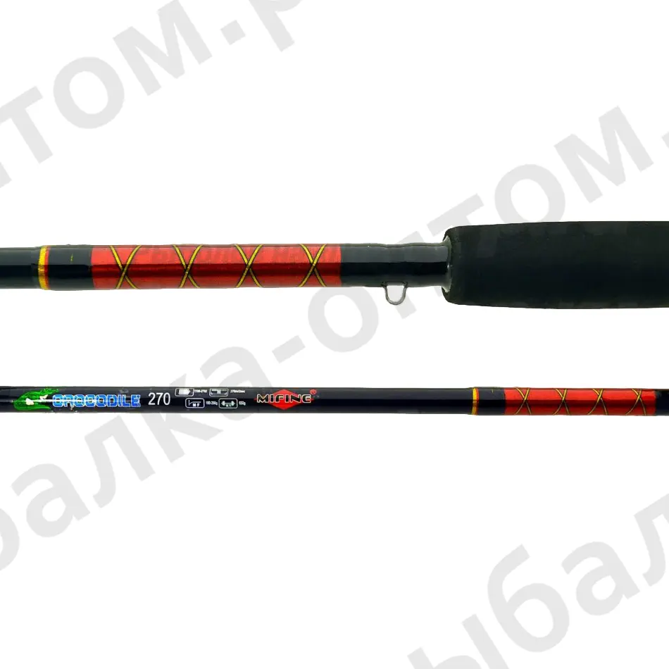 Универсальный, популярный спиннинг Mifine Crocodile Spin сделан из стеклопластика, что делает его очень прочным, но тяжелым. Тип соединения колен спиннинга штекерное, а дополнительная гайка скрепляет их, предотвращает возможное отсоединение или вылет при забросе снасти. Качественные кольца! Крокодил применяется восновном для ловли на донку-фидер, так же возможен и троллинг.