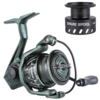 Катушка Mifine Courage Spin с прочным корпусом, выполненным из нейлона и стекловолокна и алюминиевой шпулей.