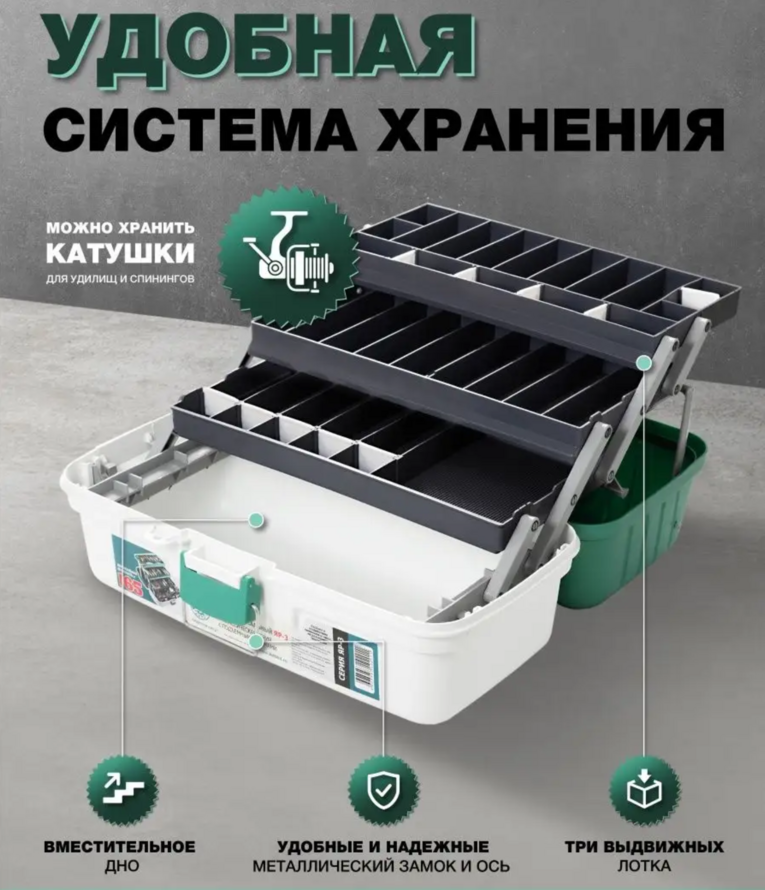 Ящик рыболовный ЯР-3 выполнен из высококачественного полипропилена, который удароустойчив, влагонепроницаем и устойчив к изменению температур, при этом материал не вступает в химическую реакцию с силиконовыми приманками, твистерами, что делает его незаменимым помощником в любом виде рыбалки. Вертикальная нагрузка на коробку для хранения в 165 кг позволяет использовать его в качестве сидения, не боясь за его целостность. Ручка бокса надежная, со специальными фиксаторами с двух сторон, которые исключают возможность прогиба ручки, при полной загрузке снастями. Органайзер для инструментов закрывается на прочную защелку с металлической скобой, которая полностью убирает самопроизвольное открывание, а оси из металла обеспечивают надежность крепления и долговечность использования данной модели короба. При открытии крышка служит опорой, 3 лотка выдвигаются вертикально с помощью крепких рычагов.