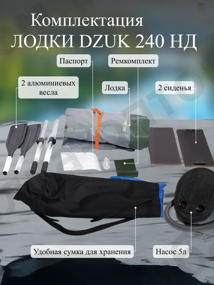Комплектация лодки DZUK 240 НД включает в себя весла, насос, ремкомплект и сумку для транспортировки. Возможность установки навесного транца позволяет использовать лодку с маломощным лодочным мотором, расширяя диапазон применения и повышая скорость передвижения по воде. Данная модель является оптимальным выбором для рыбалки, охоты и активного отдыха на воде, сочетая в себе компактность, надежность и функциональность.