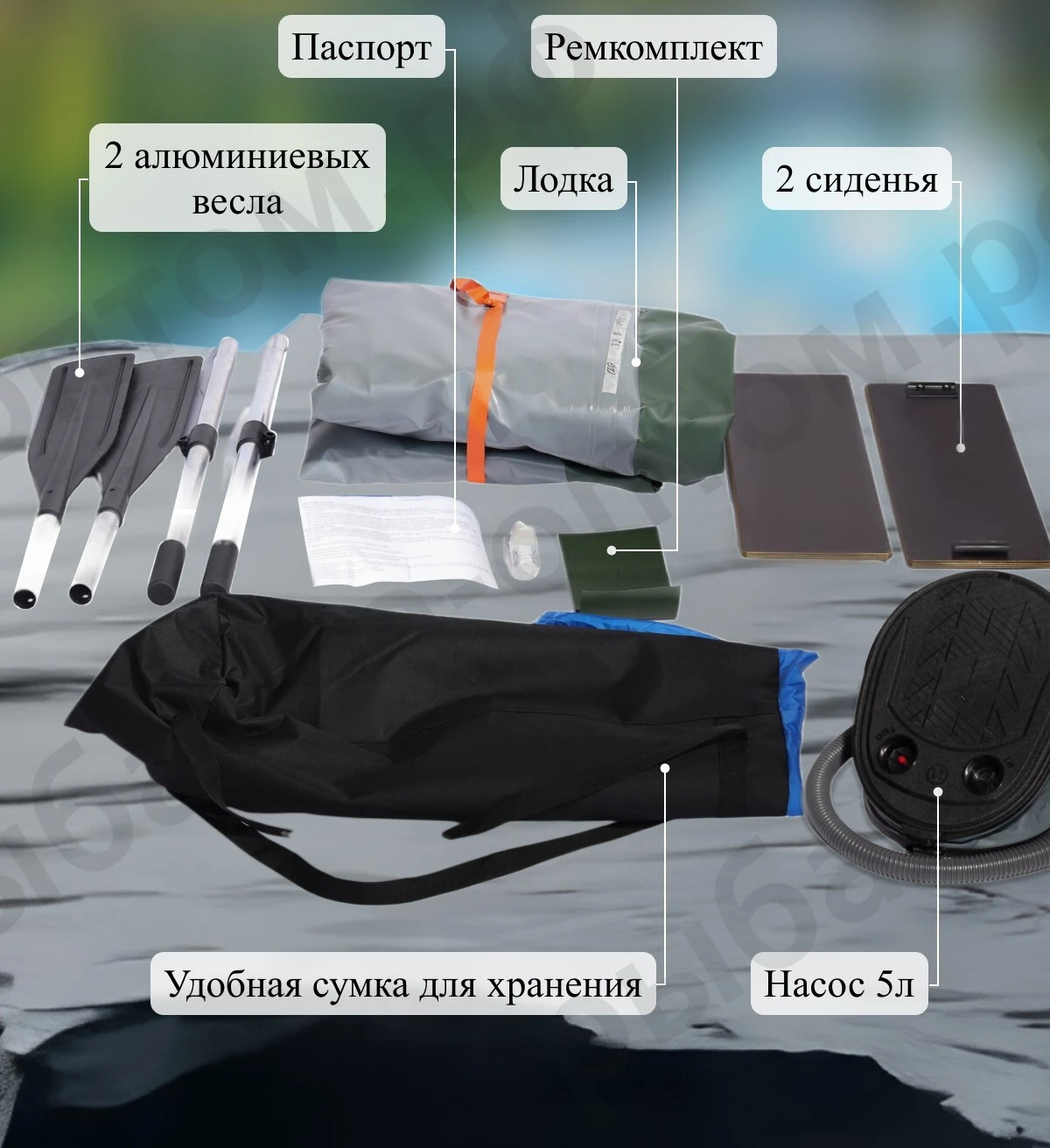 В стандартную комплектацию входят весла, насос, ремонтный комплект и сумка для переноски, обеспечивая готовность к эксплуатации сразу после приобретения. Дополнительно, возможна установка навесного транца для маломощного лодочного мотора, что расширяет функциональные возможности и позволяет использовать лодку для преодоления значительных расстояний.