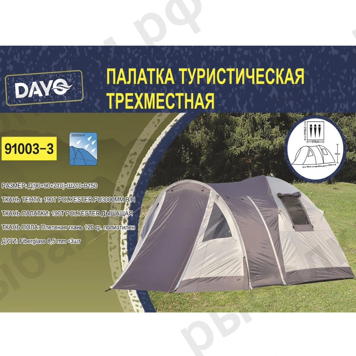 Палатка DAYO трёхместная, (90+90+210)х230х170см